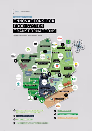 thus replace the dominant institution of food as a mere commodity. Instead, food consumers share the costs of agricultural production as well as the resulting harvest. Farmers and consumers share the relatively high risk of agricultural production (CSX Netzwerk, 2023). The following image gives an overview of some alternative digital technologies for CSAs and other forms of agro-ecological food production that are currently available in Germany, Austria, and Switzerland. The illustration is certainly not comprehensive and similar technological innovations have also sprung up in other contexts, such as FarmOS in the US. These alternative technologies can contribute to more strongly linking local food producers and urban consumers, be it through digitally supported CSAs or digitally enabled direct marketing. Robotics for small-scale agriculture can partially replace labour intensive and monotonous tasks, such as weeding on agro-ecological farms,